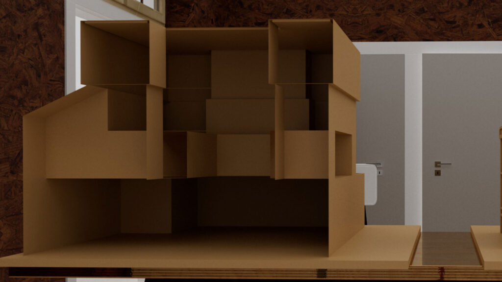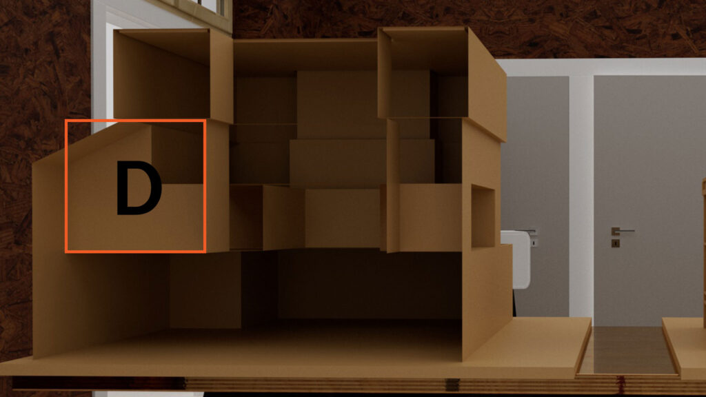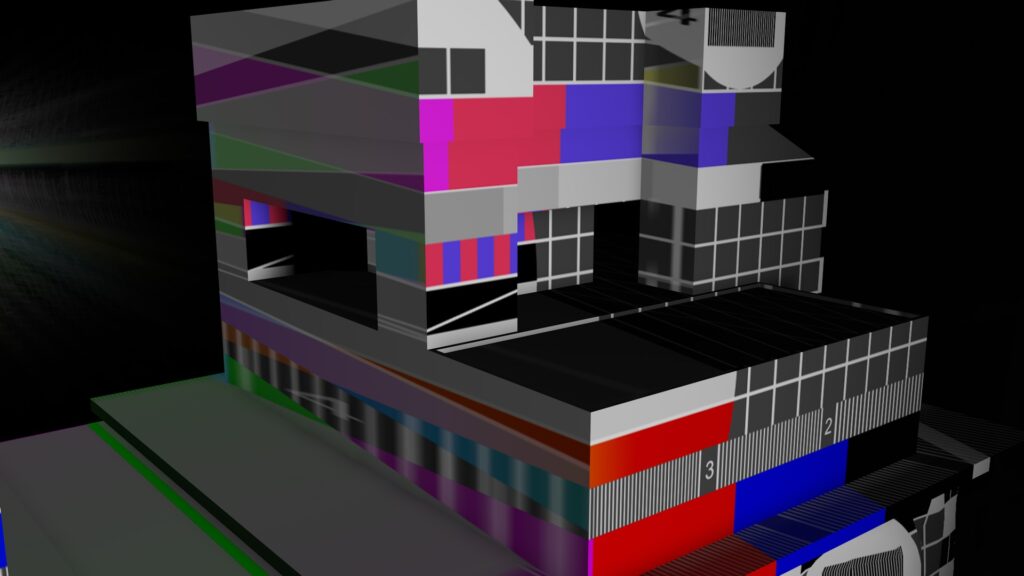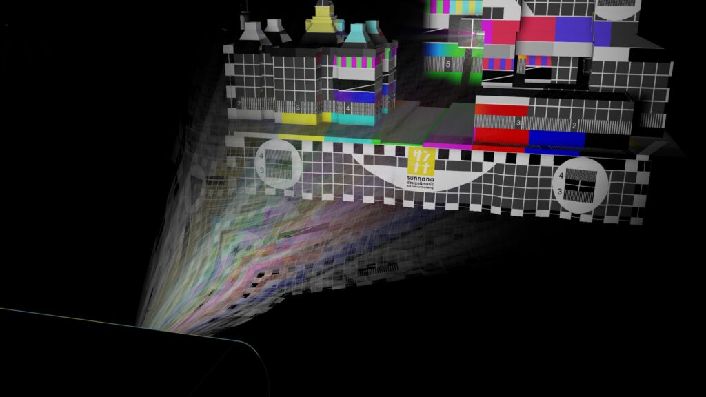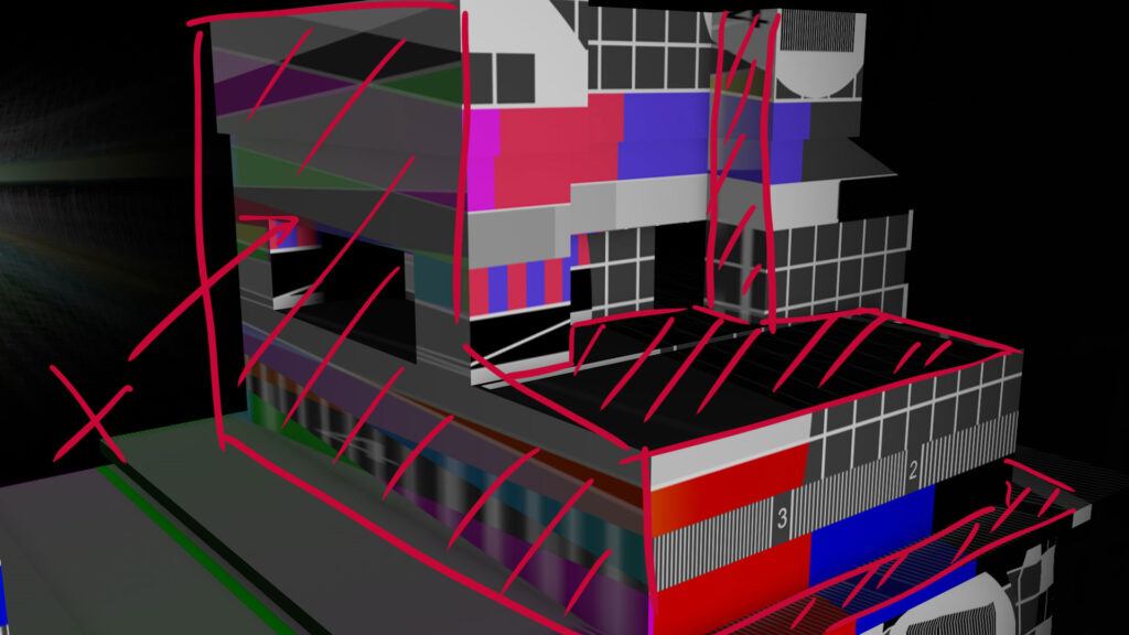まずは実際に展示する時のプロジェクターの位置を決定します。この時、上記のようにテストパターンをMadMapperから出力して、『なるべく段ボールのオブジェだけに』照射されるような位置を探しましょう。