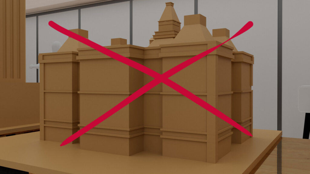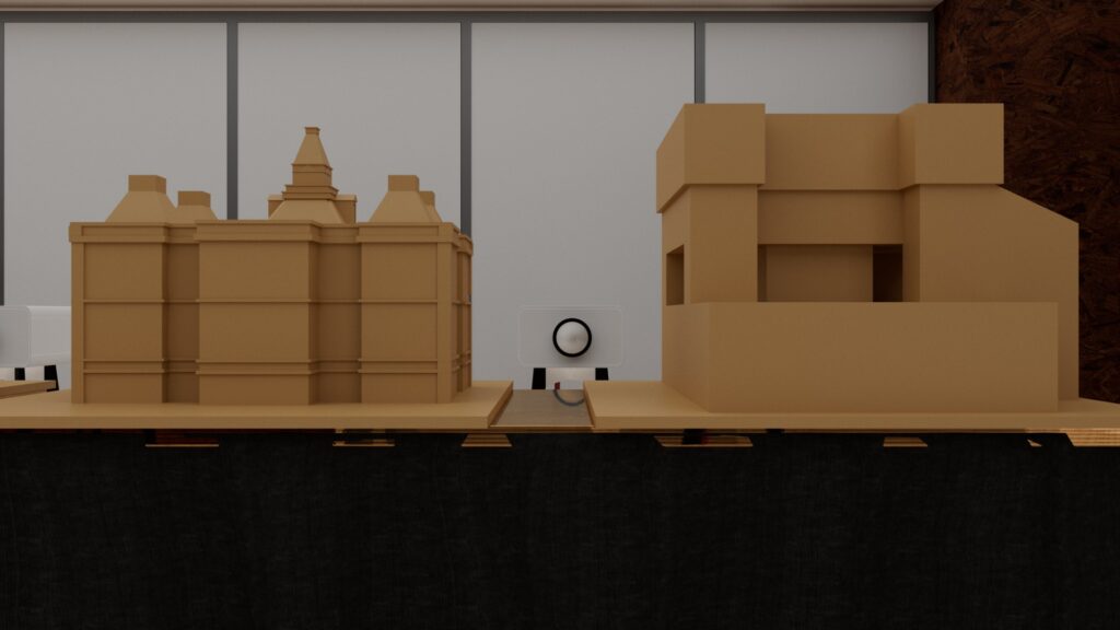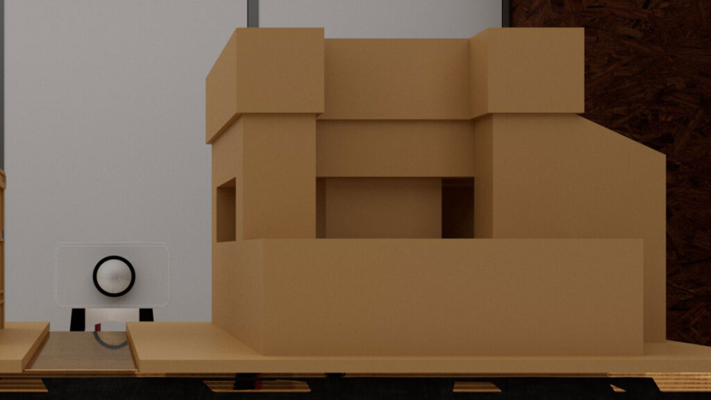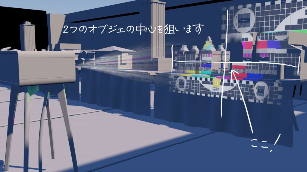 今回は欲張りな演出で、前と後ろから投影するために、2つの班のオブジェに前と後ろから協力して投影を試みます。ですので、今回のプロジェクターの位置は2つのオブジェの中心を狙います。また、上下もプロジェクター台の高さを調節して2つのオブジェの高さの中間を狙うのがベストです。相談しながら良い位置を探しましょう。