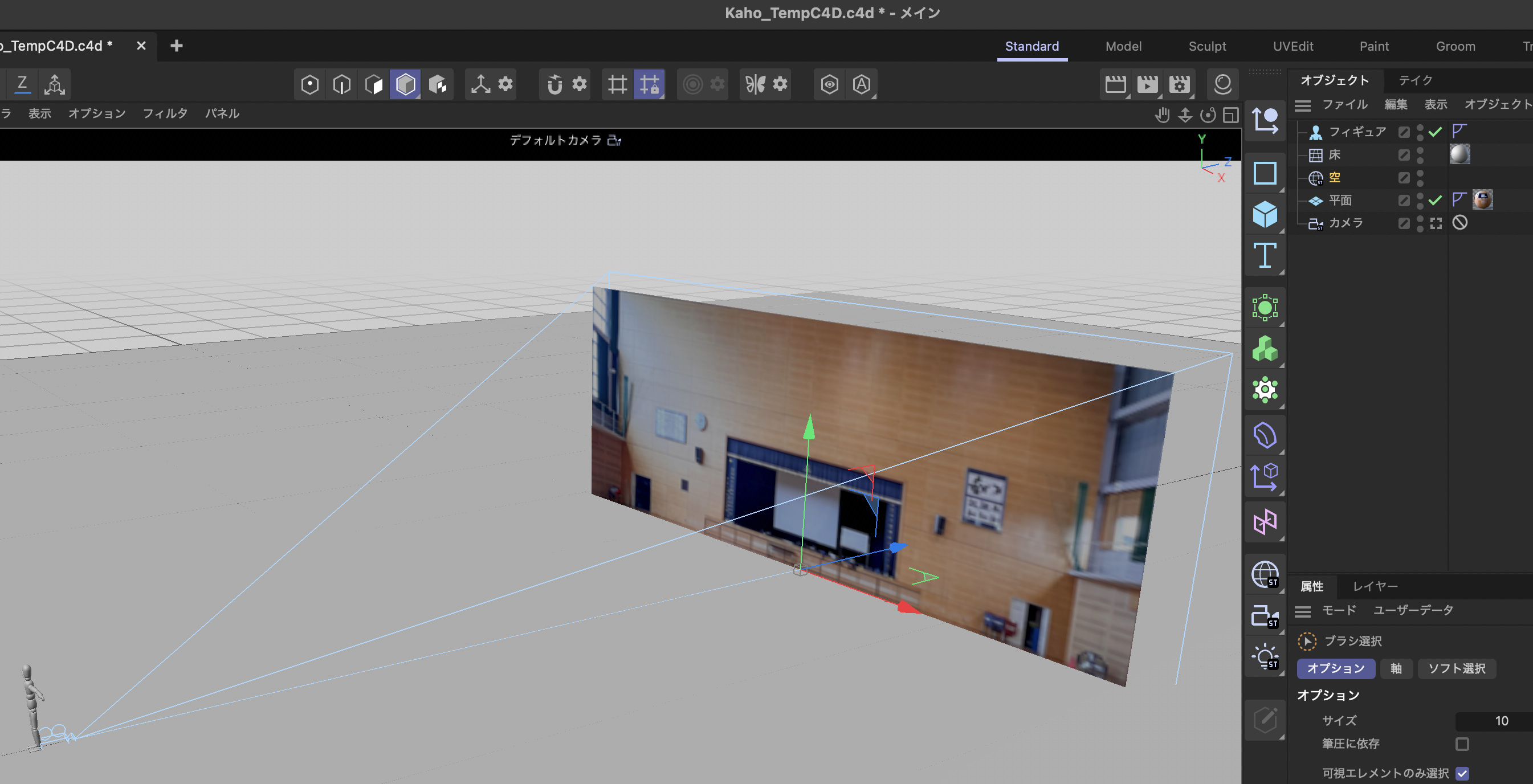 Step 1の画像を3Dソフトウエアで作成。人の目線のカメラを測定した19m地点に設置し、正面の0,0,0 位置に画像のテクスチャを貼った平面を作ります。この画像を元に、すべてのソフトのテンプレート画像とします。